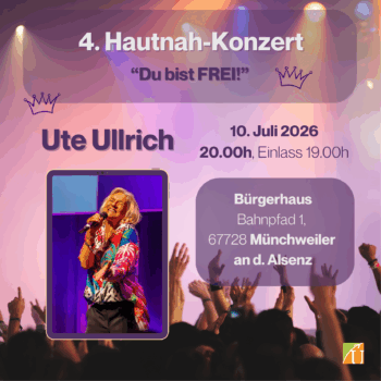 Flyer Berge-Auszeit 202610. Juli 2026 -4. Hautnah-Konzert mit Ute Ullrich! DAS musikalische HERZ-Kraft-Seminar! -FR 10. Juli 2026 - Bürgerhaus, 67728 Münchweiler an der Alsenz